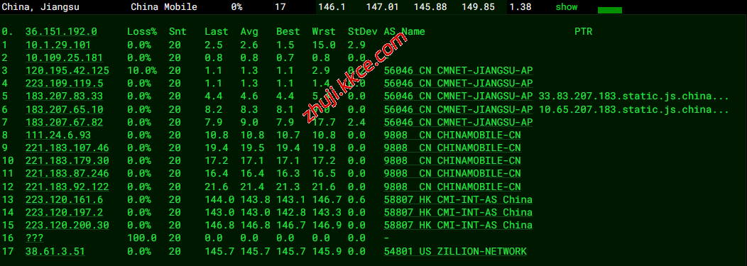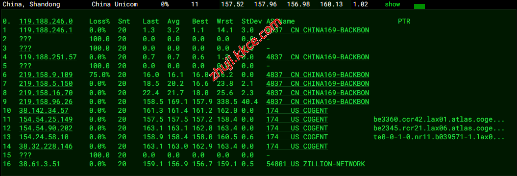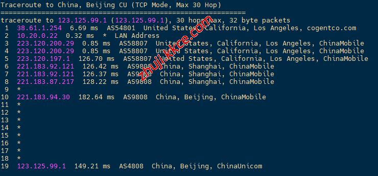 网络方面,去程电信联通都是走cogent国际线路,移动走香港CMI线路;
