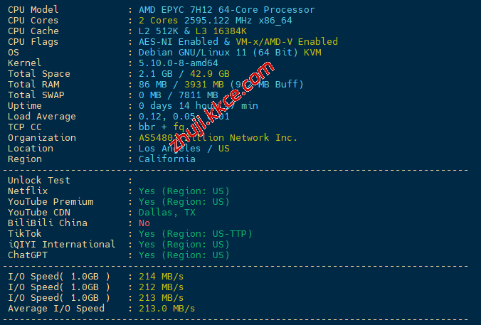 CPU型号AMD EPYC 7H12 64-Core Processor,主频2.6GHz,启用了BBR,ASN是Zillion Network的,归属地美国,当前硬盘I/O大致213MB/S的样子: