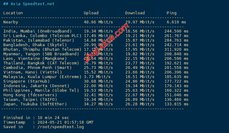 speedtest亚洲区域内的部分节点的测试数据: