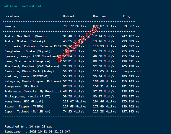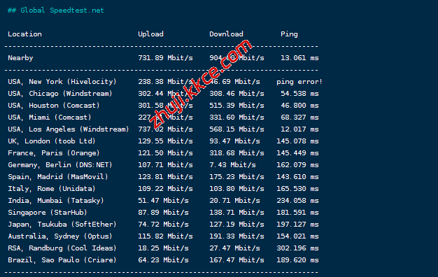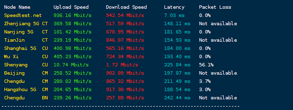 speedtest.net的国内三网节点来跑一下上下行带宽,看看在国内能冲到多少吧?大致测试结果: