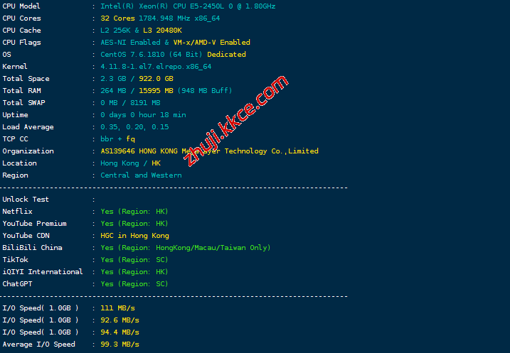 这是一台香港独立服,E5-2450L、16G内存、1T SSD,站长启用了BBR,当前硬盘I/O大致在111MB/S的样子: