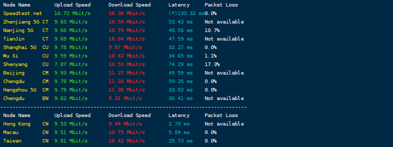 默认写的是10Mbps带宽,我们用speedtest.net在国内的多个节点跑一下,看看上行和下行吧: