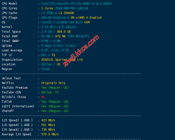 CPU为Intel(R) Xeon(R) CPU E5-2690 v4,2.6GHz主频,站长启用了BBR,斯巴达自己广播的IP,当前硬盘I/O大致在570M/S的样子: