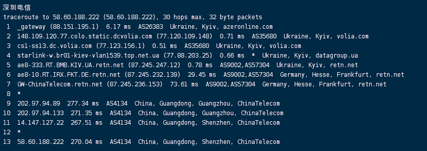 电信回程:走volia转datagroup再转retn德国法兰克福回国