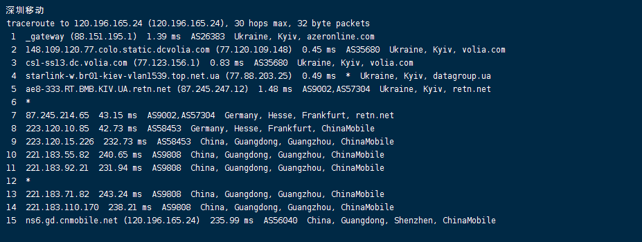 移动回程:走volia转datagroup再转retn德国法兰克福回国