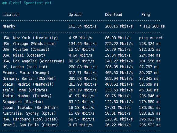 speedtest的国际节点测试结果: