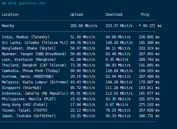 speedtest亚洲区域内的部分节点的测试数据:
