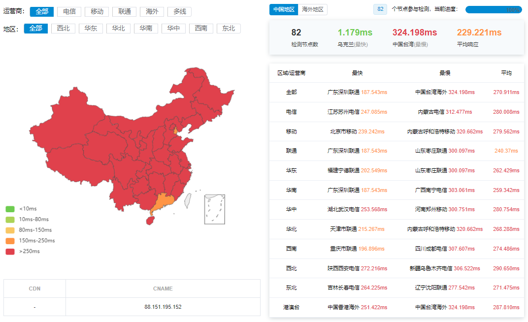 国内三网多节点的延迟数据: