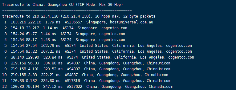 联通去程:骨干网对接TWELVE99转TELSTRA香港节点再走hostuniversal去机房