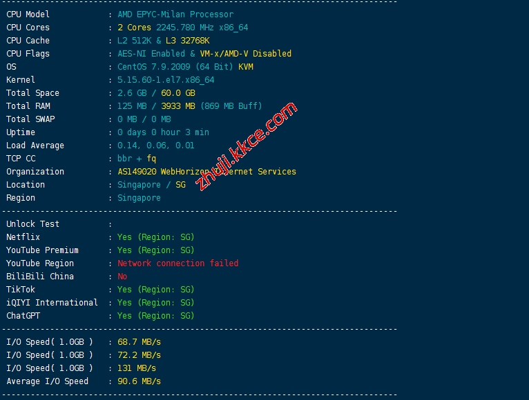 CPU型号AMD EPYC-Milan Processor,主频大致2.25GHz,启用了BBR,支持IPv6,IP归属新加坡,当前I/O测试结果大致90MB/S