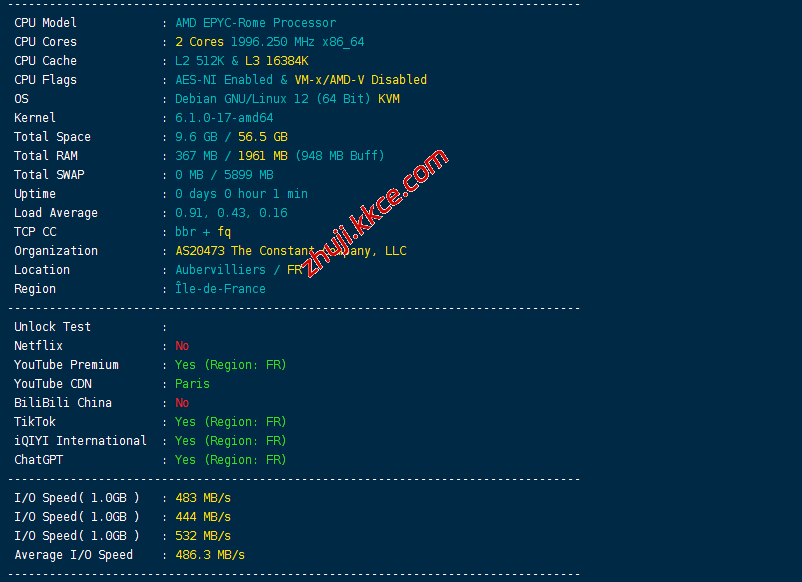 CPU型号AMD EPYC-Rome Processor,主频大致2.0GHz,启用了BBR,支持IPv6,IP归属法国,当前I/O测试结果大致486MB/S