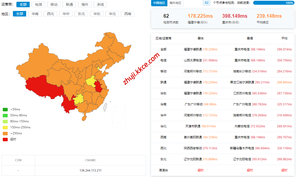 国内三网多节点的延迟测试数据: