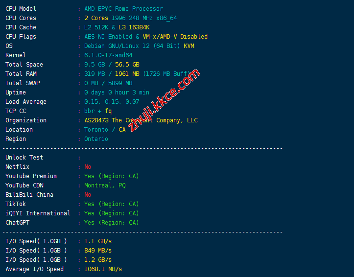 CPU型号AMD EPYC-Rome Processor,主频大致2.0GHz,启用了BBR,支持IPv6,IP归属加拿大,当前I/O测试结果大致1068MB/S