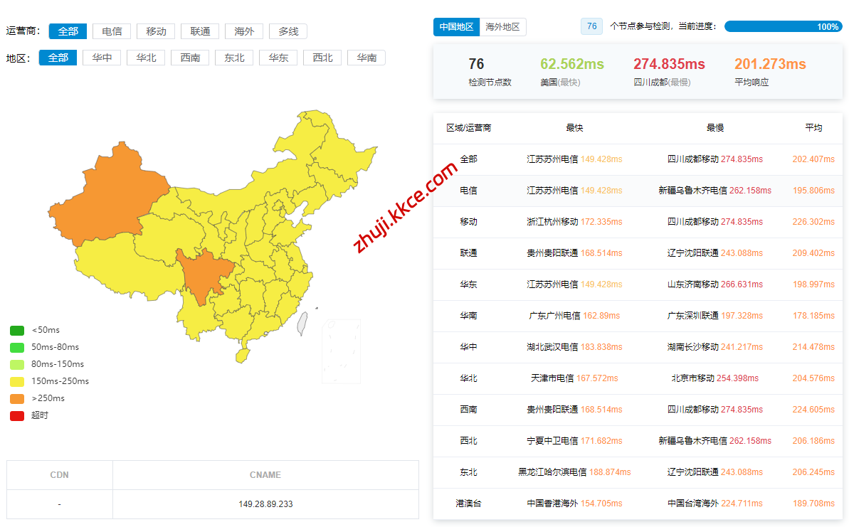 国内三网多节点的延迟测试数据: