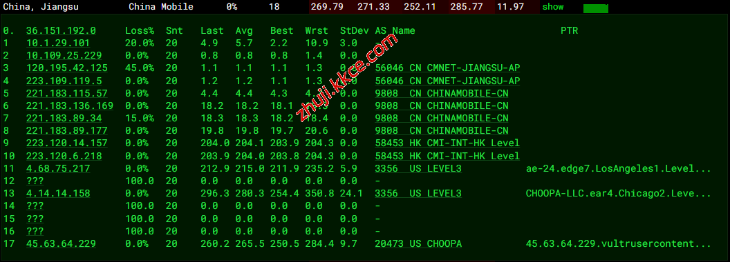移动去程:直连移动香港节点转LEVEL3去机房