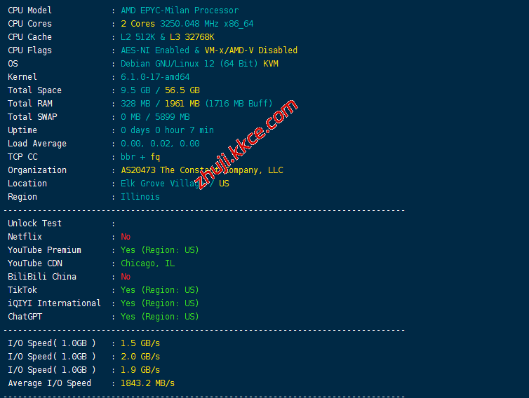 CPU型号AMD EPYC-Rome Processor,主频大致3.25GHz,启用了BBR,支持IPv6,IP归属美国,当前I/O测试结果大致1843MB/S