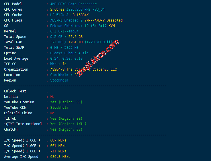 CPU型号AMD EPYC-Rome Processor,主频大致2.0GHz,启用了BBR,支持IPv6,IP归属瑞典,当前I/O测试结果大致686MB/S