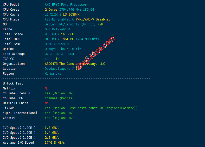 CPU型号AMD EPYC-Rome Processor,主频大致2.8GHz,启用了BBR,支持IPv6,IP归属南非Karnataka,当前I/O测试结果大致1.7GB/S
