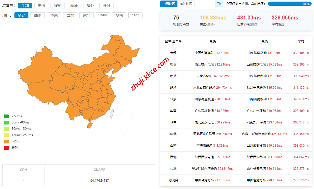 国内三网多节点的延迟测试数据: