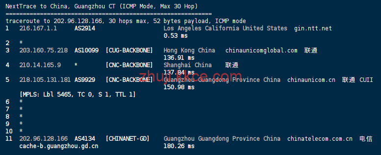 中国移动:经由香港 CMI 汇聚后,通过 NTT 骨干网跨太平洋直达洛杉矶节点。