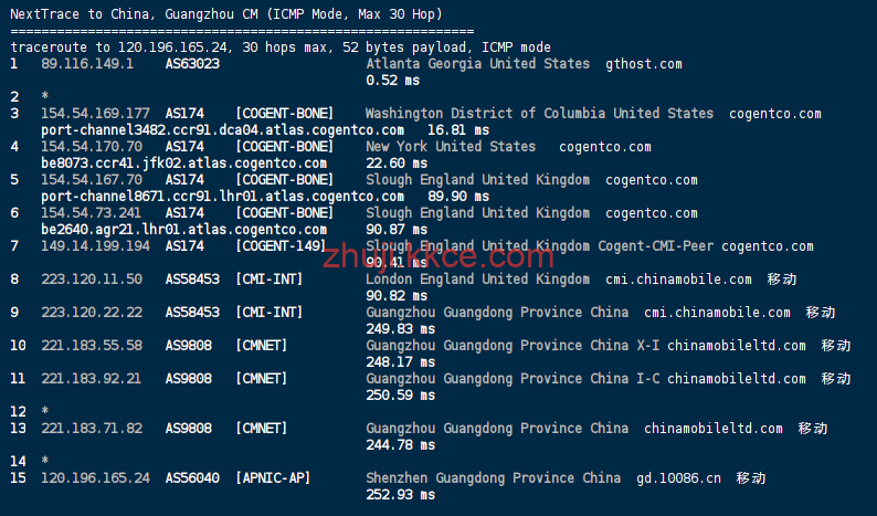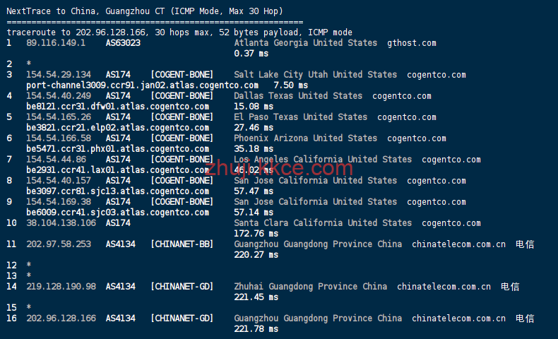 中国电信 (China Telecom): 从亚特兰大出发,经由 Cogent (AS174) 纵贯美国本土抵达美西枢纽,随后通过 AS4134 (CHINANET) 骨干网回国。