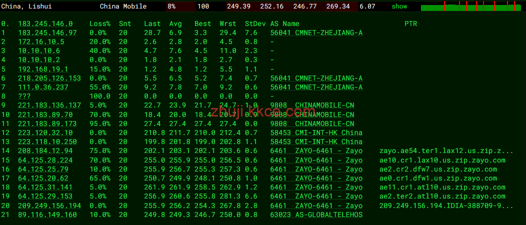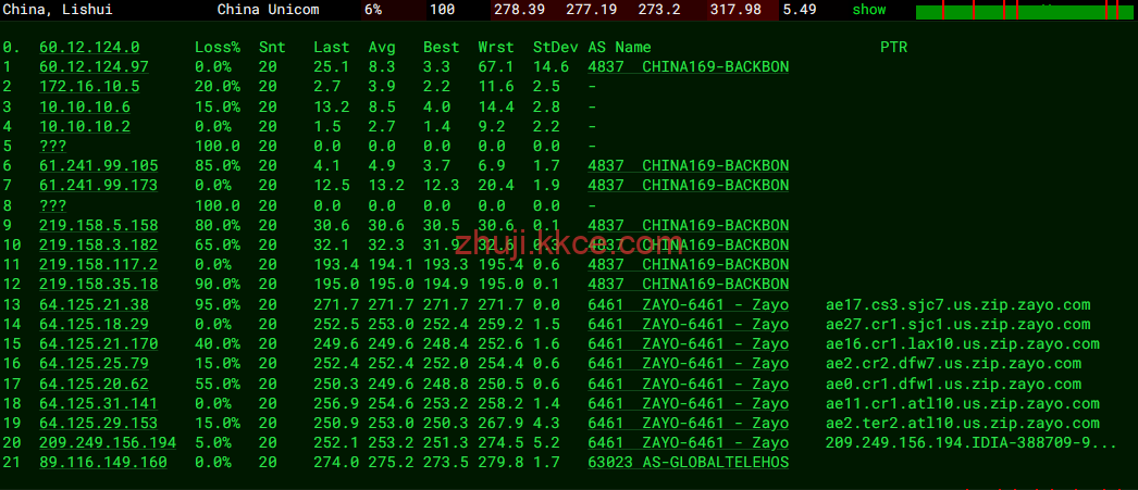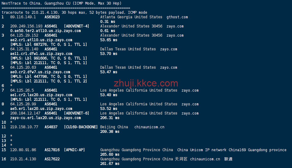 中国联通:通过 Zayo (AS6461) 国际骨干网直连接入,路径清晰,跳数优化明显。