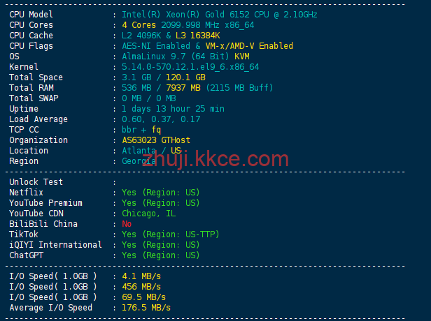 - 系统环境: 预装 AlmaLinux 9.7 企业级操作系统,内核版本 5.14。默认开启 BBR + FQ 拥塞控制算法,显著优化了跨大西洋与跨太平洋的长距离传输效率。