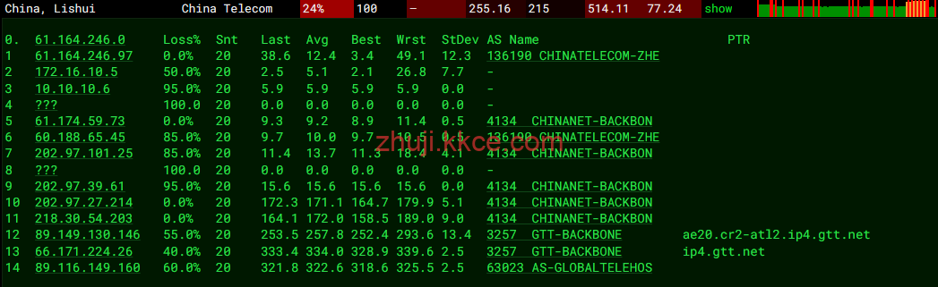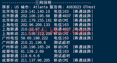 中国电信:经电信骨干网出海,由 GTT (AS3257) 链路承载,横跨美国本土后接入亚特兰大。
