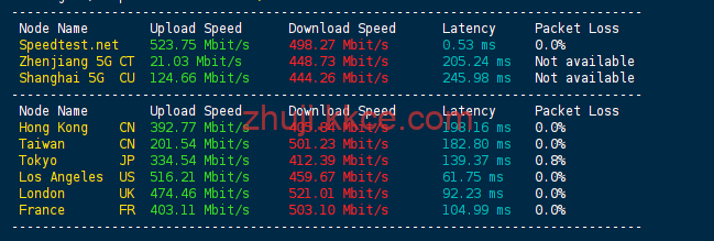 Speedtest国内多节点以及部分海外测试上下行速度:
