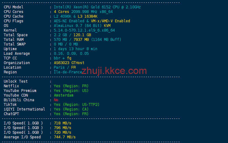 - 卓越磁盘性能: 实测平均 I/O 速度达到 744.7 MB/s,峰值逼近 800 MB/s。这一数据水平意味着该节点能轻松应对高吞吐的数据库读写及内容分发任务。