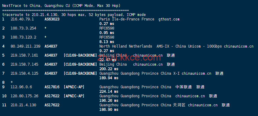 中国联通:经由联通骨干网通过 AMS-IX 100Gbps 极速通道直达欧洲节点。