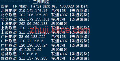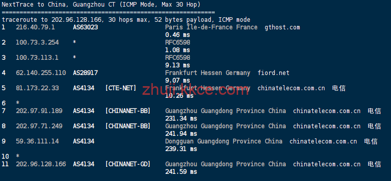 中国电信 (China Telecom): 由巴黎直发,经 GTT 对接 AS4134 (CHINANET) 国际出口骨构网回国,延迟保持在欧洲节点的正常水平。