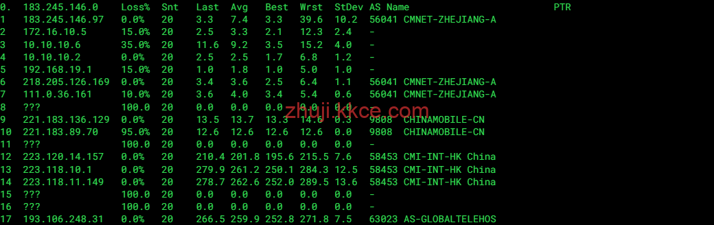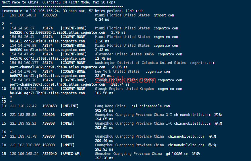 中国移动 (China Mobile): 路径较长。经由 Cogent (AS174) 跨越大西洋绕行伦敦,再经香港 CMI 回国。