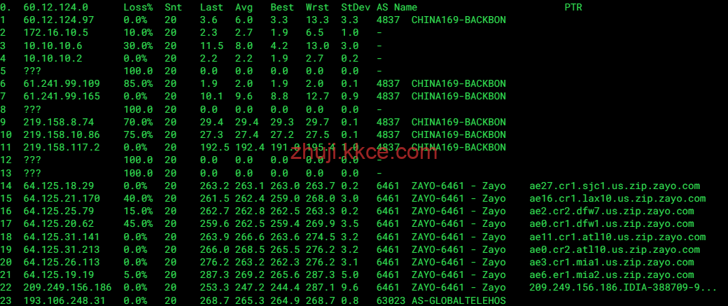 中国移动: 经由 CMI (AS58453) 跨太平洋接入,随后由 Zayo 承担全美境内的长途转运,确保了低丢包率。