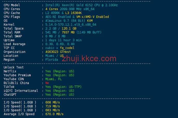 - 计算平台: 搭载 Intel® Xeon® Gold 6152 处理器(Skylake 架构),4 核心并发,主频稳定。配合 AlmaLinux 9.7 最新系统,计算环境极其纯净,Load Average 表现稳健。