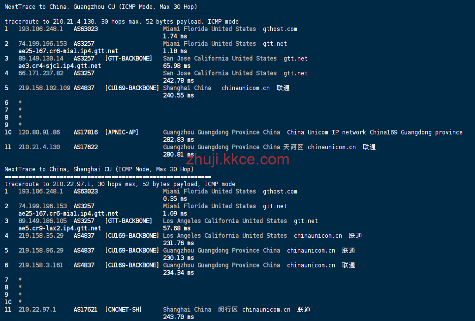 中国联通 (China Unicom): 迈阿密直连,通过 GTT (AS3257) 核心 PoP 点直接对接联通回国链路。