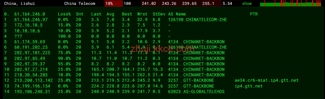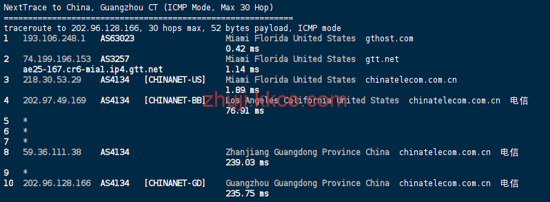 中国电信: 经由电信出口骨干网,直连 GTT (AS3257) 全美光纤内网抵达迈阿密。