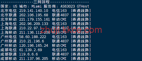 中国电信 (China Telecom): 迈阿密直连,强制经由 AS4134 (CHINANET) 国际出口骨干网回国,延迟表现最稳。