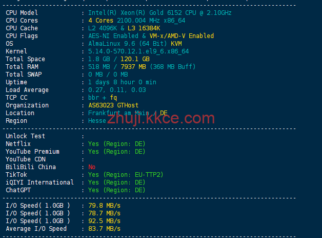 - 硬件规格: 搭载 Intel® Xeon® Gold 6152 处理器。作为 Intel 的金牌系列,其单核睿频表现与多线程调度能力极其卓越。实测 4 核心并发 负载极低,L3 16MB 缓存 确保了在运行复杂 AlmaLinux 9.6 环境或执行高性能加解密任务时的瞬时响应能力。