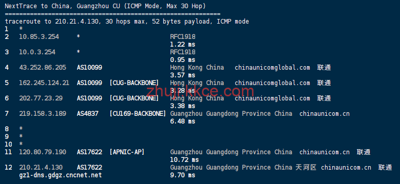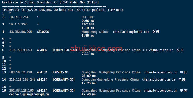 中国电信 (China Telecom): 香港直回,流量经由联通国际 AS10099 (CUG) 承载至广州出口,随后转入 AS4134 (CHINANET) 电信骨干网。