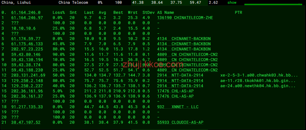 中国电信: 经由电信骨干网,在国际出口段接入 CN2 (AS4809) 精品链路,随后通过 NTT (AS2914) 链路在香港本地落地机房。