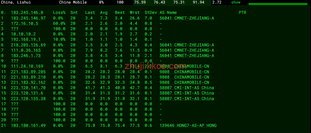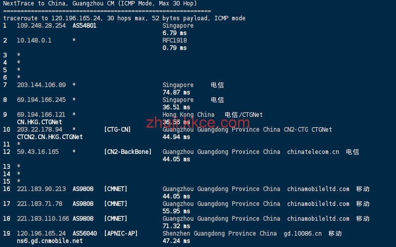 中国移动:流量经由 CMI (AS58807) 汇聚,通过香港国际出口直达新加坡。