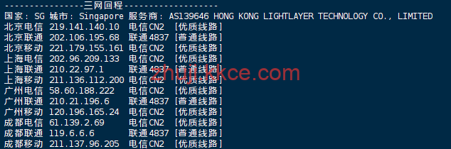 中国移动 (China Mobile):由新加坡出口直连 CMI (AS9808) 移动骨干网快速回传。