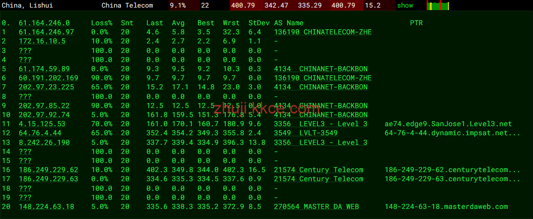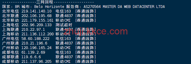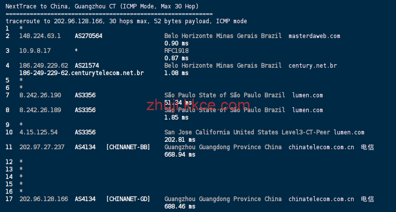 中国电信:经由电信骨干网直连,通过 Level3 (AS3356) 链路在圣何塞汇聚后接入巴西本地运营商 Century Telecom 直达机房。