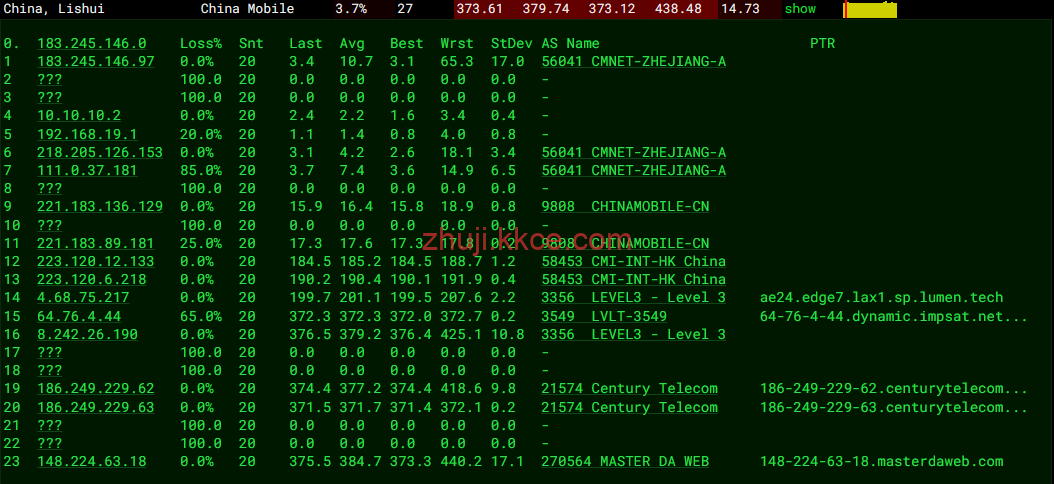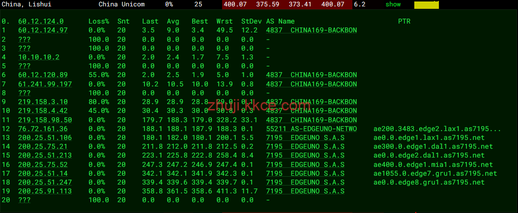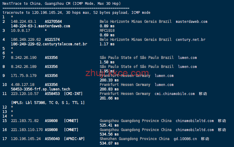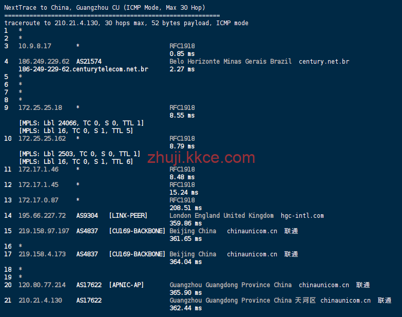 中国联通 (China Unicom):表现独特,由巴西经由 HGC 链路绕行伦敦 (LINX) 交换中心,随后接入 AS4837 (CU169) 骨干网直回中国。