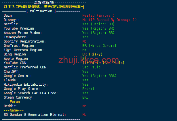 - 高权重资源:分配纯净的巴西原生 IP,具备极高的本地化识别特征(Native IP)。根据测试结果,该 IP 完美解锁 Netflix (BR)、YouTube Premium (BR) 及 ChatGPT (BR),在流量触发及账号权重判定中具备天然优势,能够稳健应对南美主流平台的风控审查。