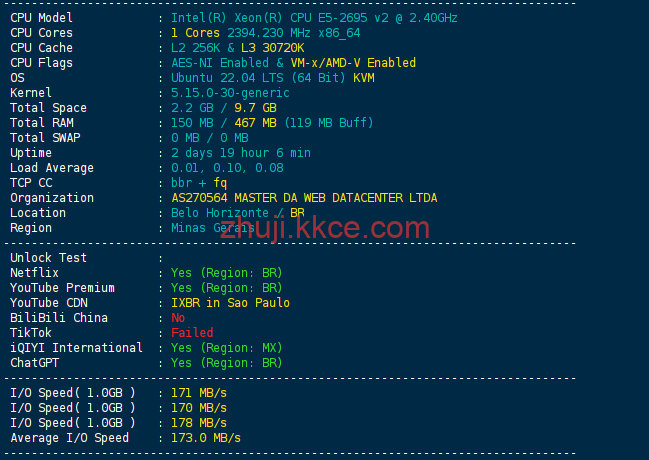 宿主机搭载 Intel® Xeon® E5-2695 v2 处理器,单核主频为 2.40 GHz。本次实例配置为 1 核心 算力,配合 L3 30MB 缓存,虽内存设定为轻量级,但系统运行 Ubuntu 22.04 LTS 表现稳定。分配的 IPv4 地址由巴西本地运营商 MASTER DA WEB (AS270564) 直接广播,物理归属地精确识别为巴西贝洛奥里藏特(Belo Horizonte)。与非原生 IP 相比,该资源在底层数据库中拥有更高的地理信任等级。