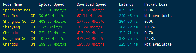 Speedtest国内多节点测试上下行速度:
