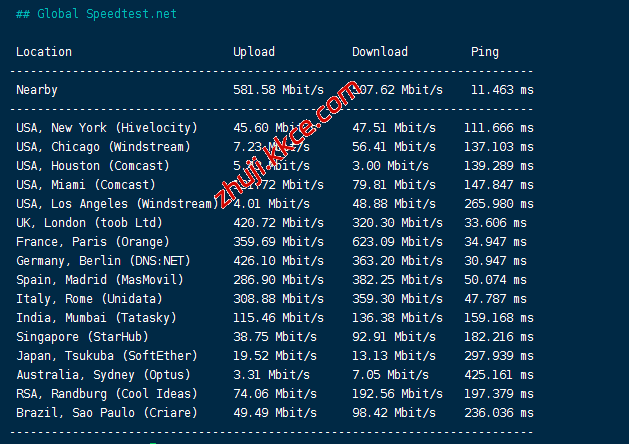 speedtest的国际节点测试结果:
