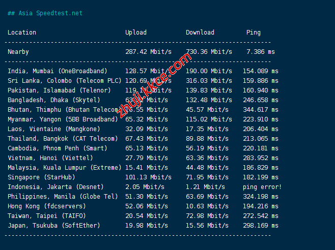 speedtest亚洲区域内的部分节点的测试数据: